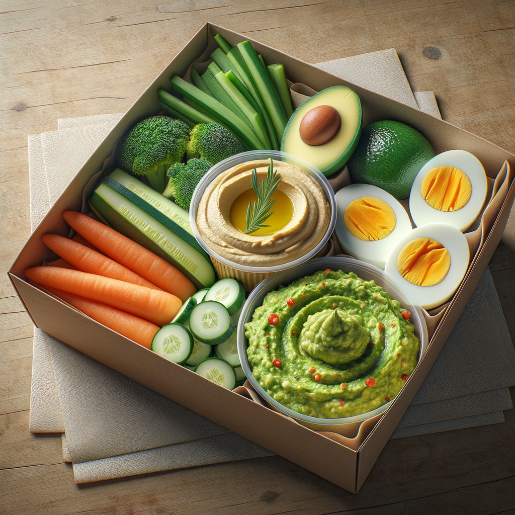 A protein-packed snack box with savory hummus, crisp vegetables for dipping, hard-boiled eggs, and a hearty portion of guacamole for a satisfying midday boost.