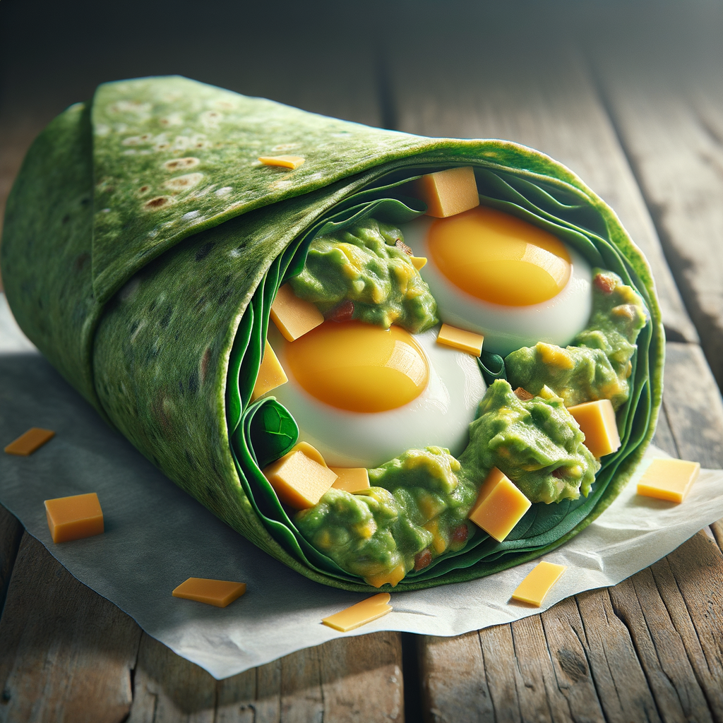 A wholesome breakfast wrap filled with fluffy egg whites, a spread of lush guacamole, and a sprinkle of cheddar cheese, all wrapped in a soft spinach tortilla. Perfect for a nutritious start to the day.