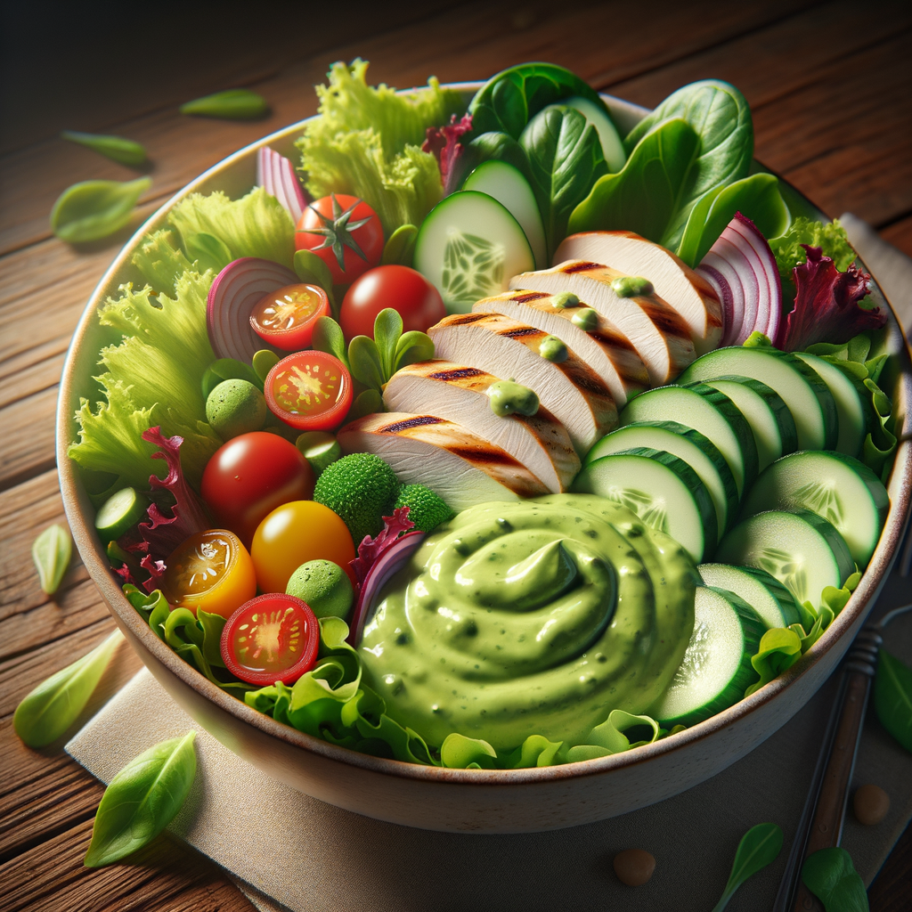 A refreshing salad bowl featuring tender slices of grilled chicken breast, mixed greens, cherry tomatoes, and cucumber, topped with a generous dollop of creamy avocado dressing. Ideal for a light lunch option.