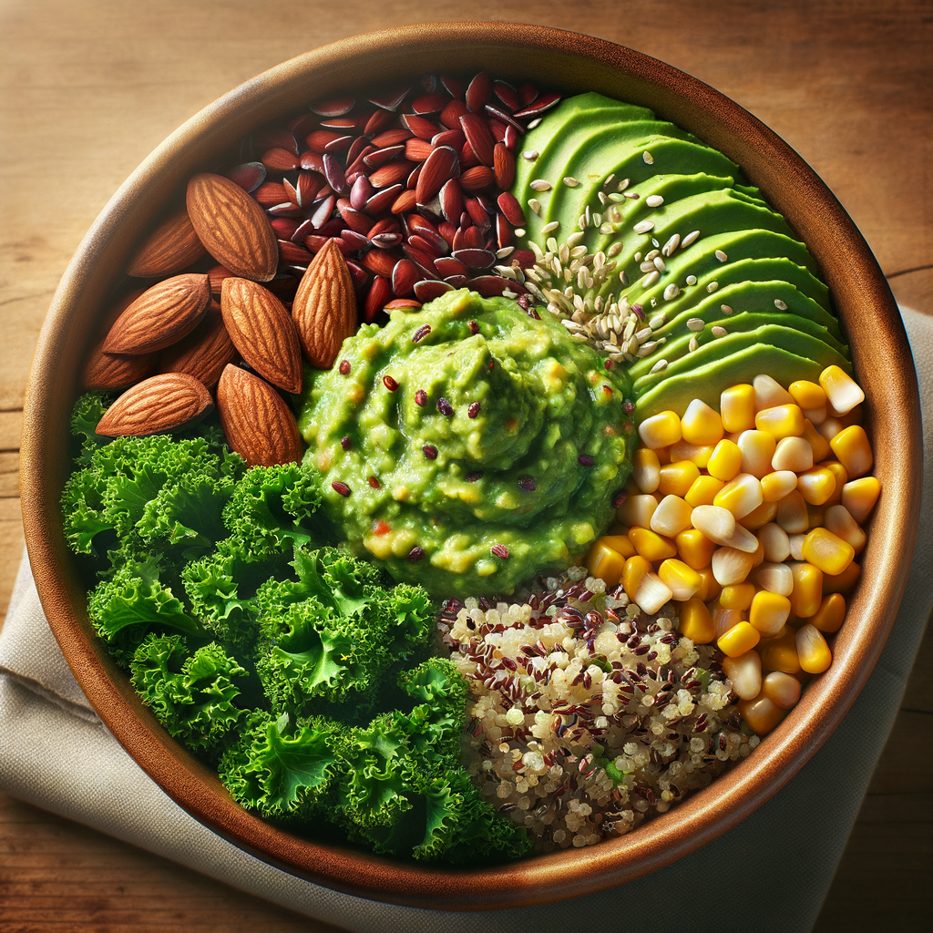 A nutrient-packed bowl with a base of curly kale, tossed with roasted almonds, red quinoa, and sweet corn kernels. It's finished with a scoop of freshly mashed guacamole and a sprinkle of hemp seeds for added texture and protein.