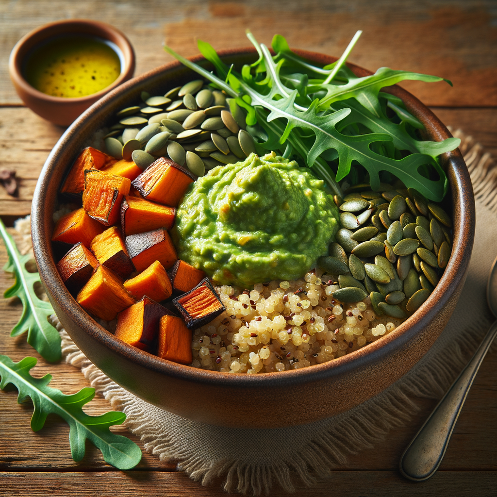 A hearty grain bowl featuring a base of organic quinoa, topped with roasted sweet potatoes, fresh arugula, crunchy pumpkin seeds, and a generous dollop of creamy guacamole. Drizzled with a light lemon avocado dressing to bring all the flavors together.