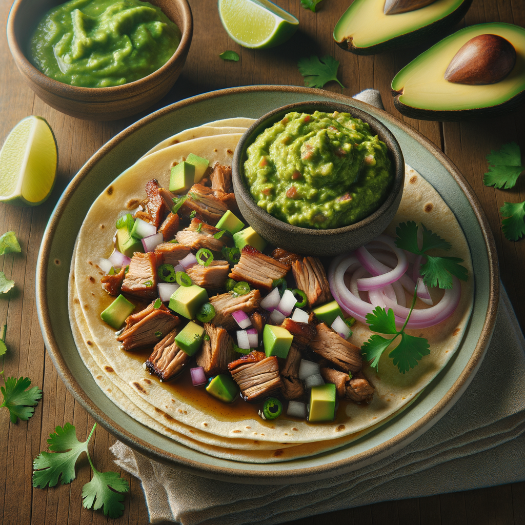Slow-cooked, tender pork carnitas served in soft corn tortillas, topped with a dollop of rich avocado salsa, diced onions, and fresh cilantro leaves.
