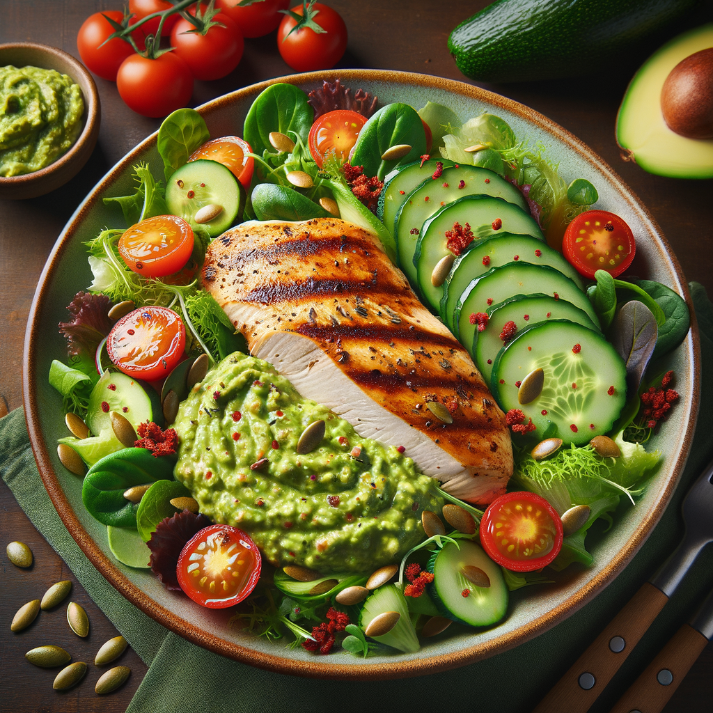 Grilled chicken breast atop a bed of mixed greens, cherry tomatoes, and sliced cucumbers, drizzled with a zesty avocado dressing, and sprinkled with toasted pumpkin seeds.