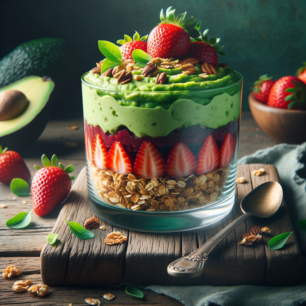 A layered parfait with creamy avocado guacamole, granola, fresh strawberries, and acai puree. A delightful balance of textures and flavors, perfect for a health-conscious indulgence.