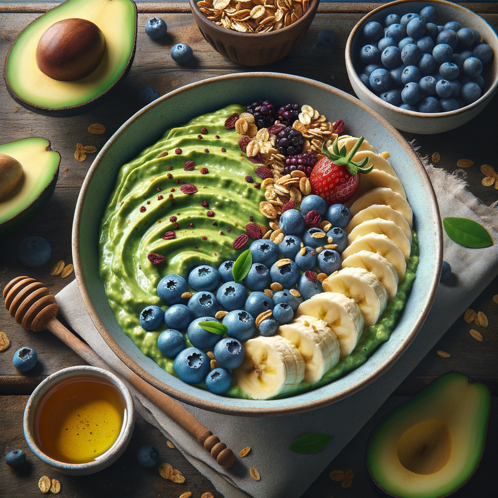 A refreshing twist on the classic acai bowl, featuring a layer of creamy guacamole, topped with fresh blueberries, sliced bananas, granola, and a drizzle of honey. Perfect for those seeking a savory and sweet combination.