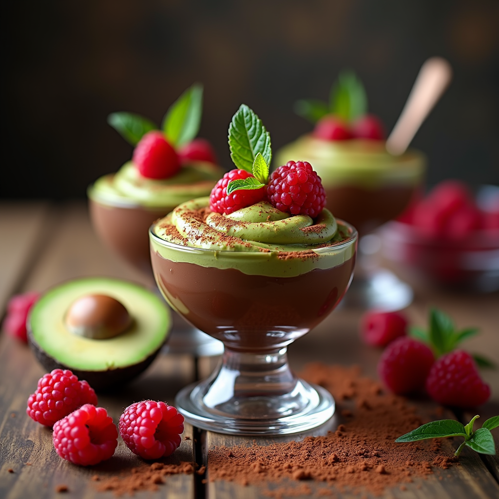Silky smooth chocolate mousse made with rich dark chocolate and creamy avocado dressing. Served in elegant cups and garnished with cocoa powder and fresh raspberries for a decadent treat.