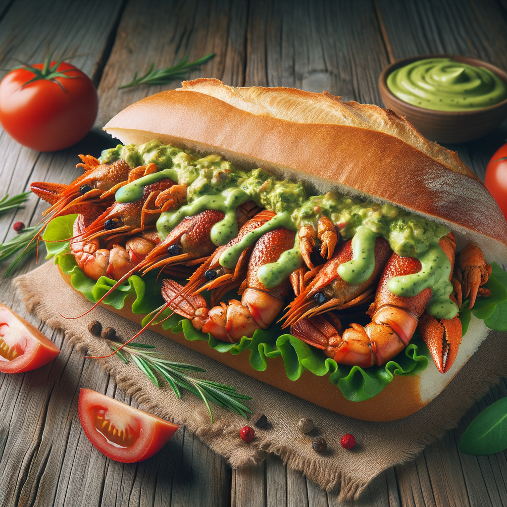 A classic po'boy sandwich filled with succulent crawfish tails, topped with a smooth avocado dressing, lettuce, and tomatoes on a fresh baguette.