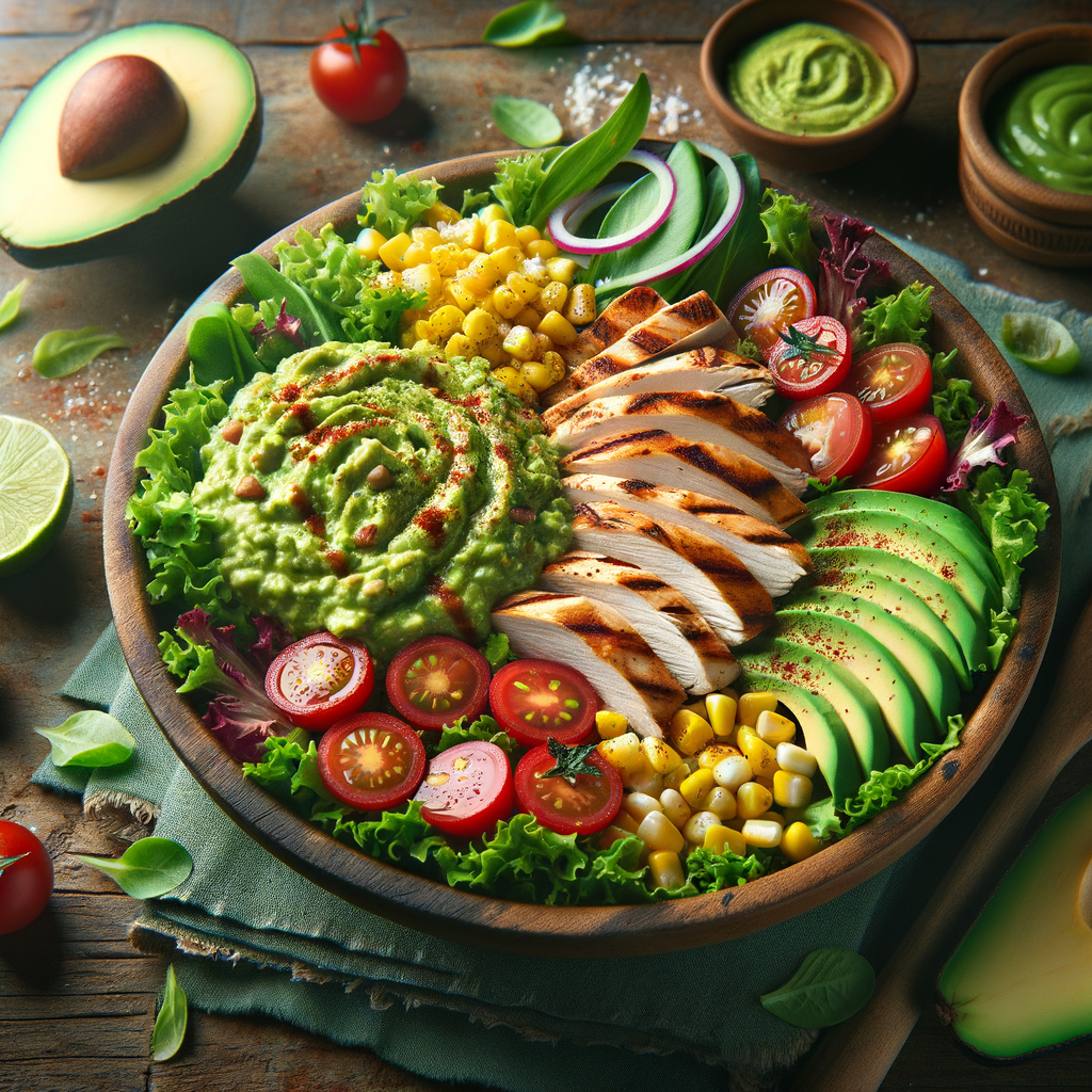 A fresh bed of greens topped with grilled chicken strips, sweet corn, cherry tomatoes, and a drizzle of avocado ranch dressing, finished with a sprinkle of shredded cheese.