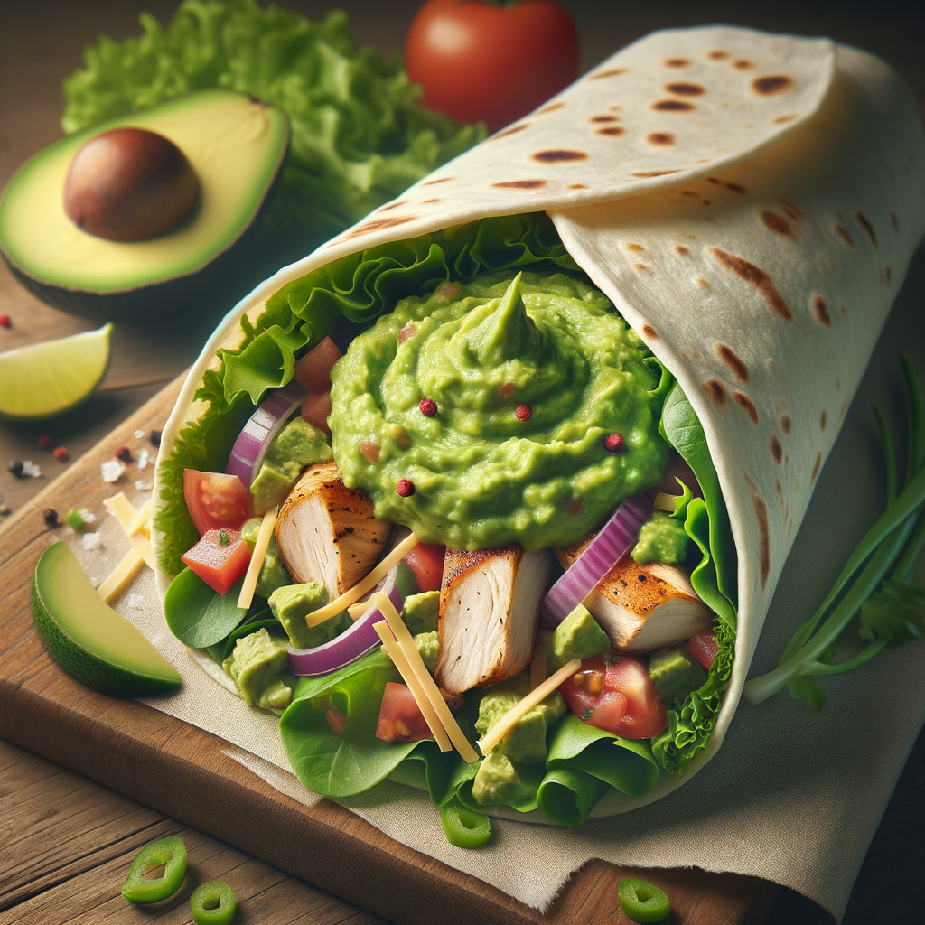 A grilled chicken wrap filled with a spicy avocado dip, mixed greens, shredded cheese, diced tomatoes, and red onions, all wrapped up in a soft flour tortilla.