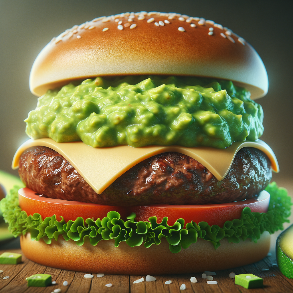 A succulent square-shaped beef patty topped with a generous dollop of freshly made guacamole, served with crisp lettuce, ripe tomato, and melty cheese on a toasted bun.