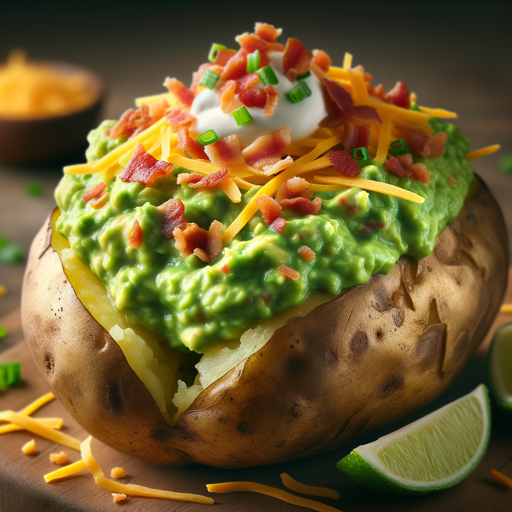 A baked potato split open and filled with a hearty scoop of guacamole, topped with shredded cheddar cheese, crispy bacon bits, and a dollop of sour cream.