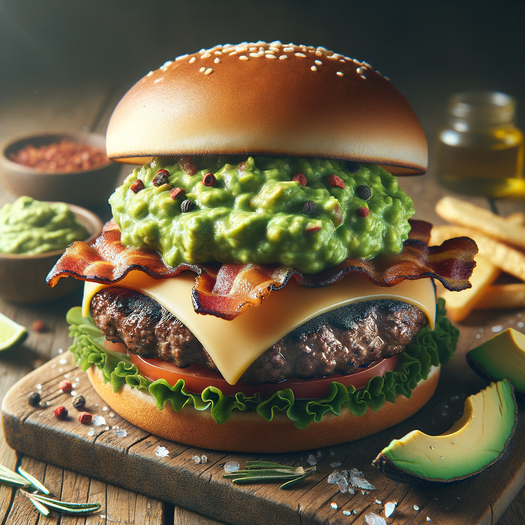 A juicy square beef patty topped with pepper jack cheese, crispy bacon, and a generous spread of spicy guacamole, served on a toasted premium bun.