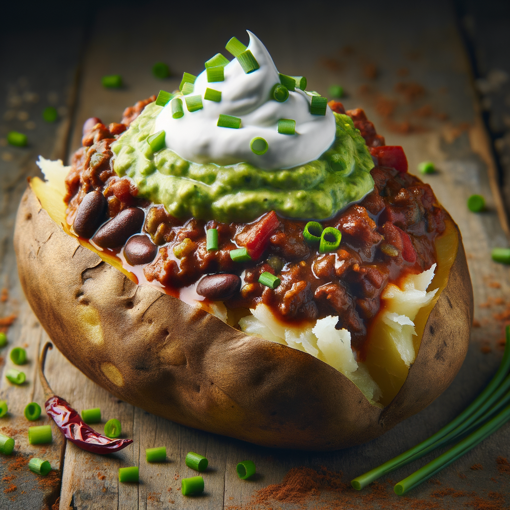 Wendy's baked potato taken to the next level with a hearty scoop of rich beef chili, a dollop of sour cream, and a smooth drizzle of avocado dressing, garnished with chives for the perfect comfort food indulgence.