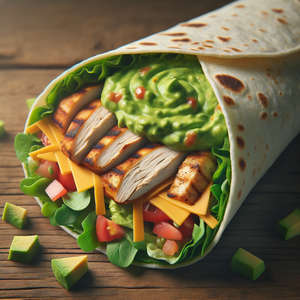 A flavor-packed wrap filled with Wendy's signature grilled chicken, mixed greens, diced tomatoes, shredded cheddar cheese, and a hearty spread of spicy avocado dip, all wrapped up in a warm, soft flour tortilla.