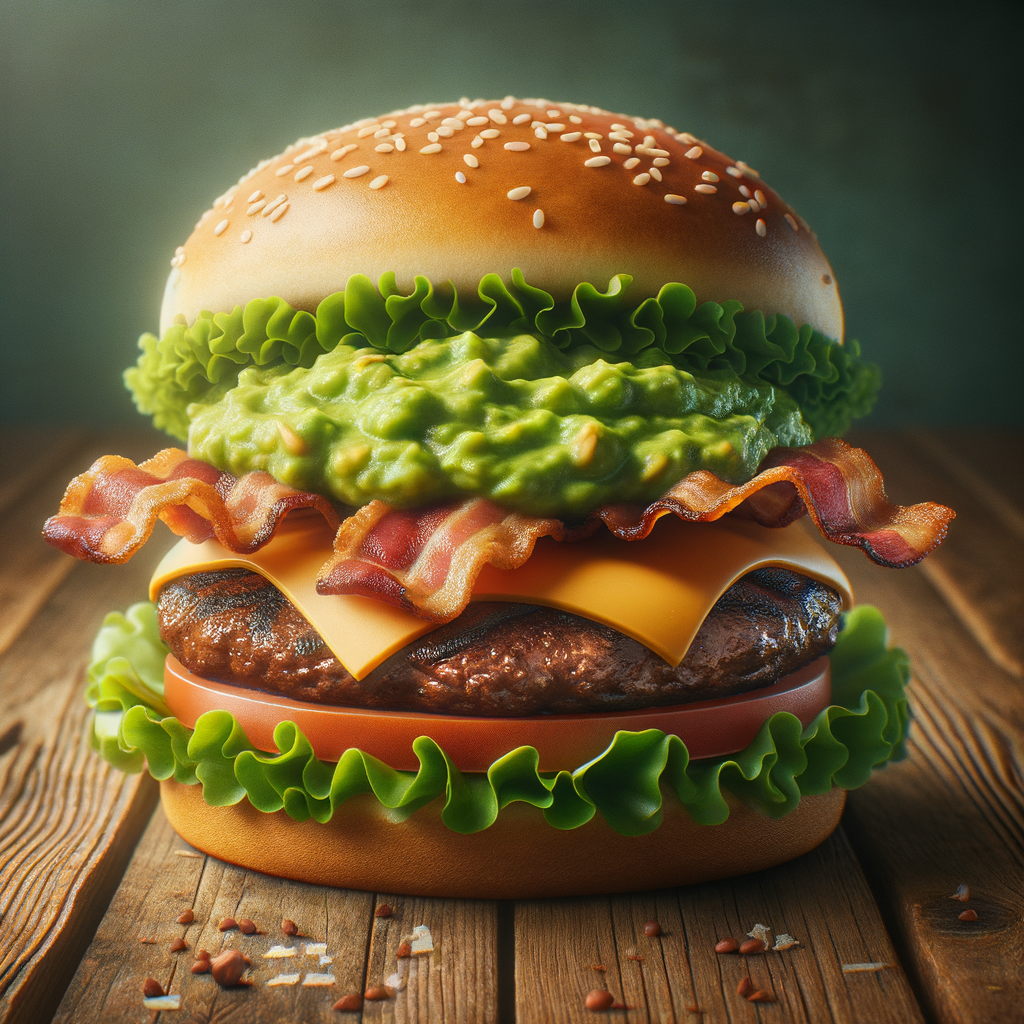 A twist on the classic Baconator, featuring layers of juicy beef patties, crispy bacon, and a generous spread of creamy guacamole. Topped with melted cheese and fresh lettuce.
