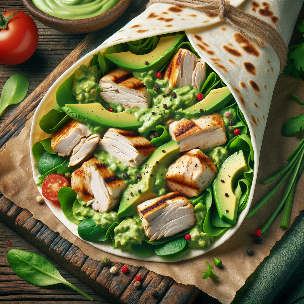 A delicious wrap filled with grilled chicken, fresh greens, and a creamy avocado dressing. Wrapped in a soft tortilla for a perfect handheld meal.