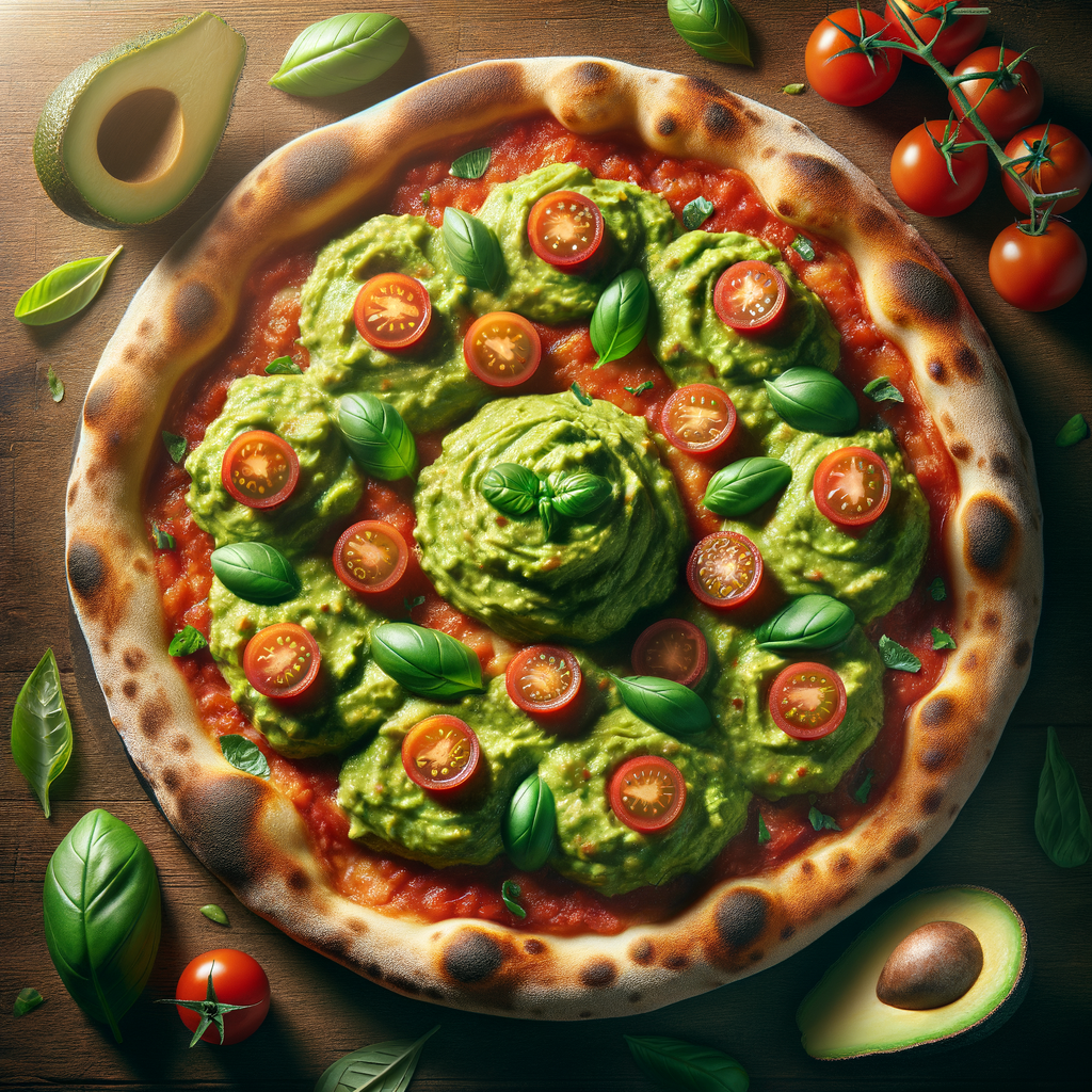 A classic Margherita pizza with a twist, featuring a base of tangy tomato sauce and fresh mozzarella cheese, topped with dollops of smooth guacamole, ripe cherry tomatoes, and fresh basil leaves, all wood-fired to perfection.