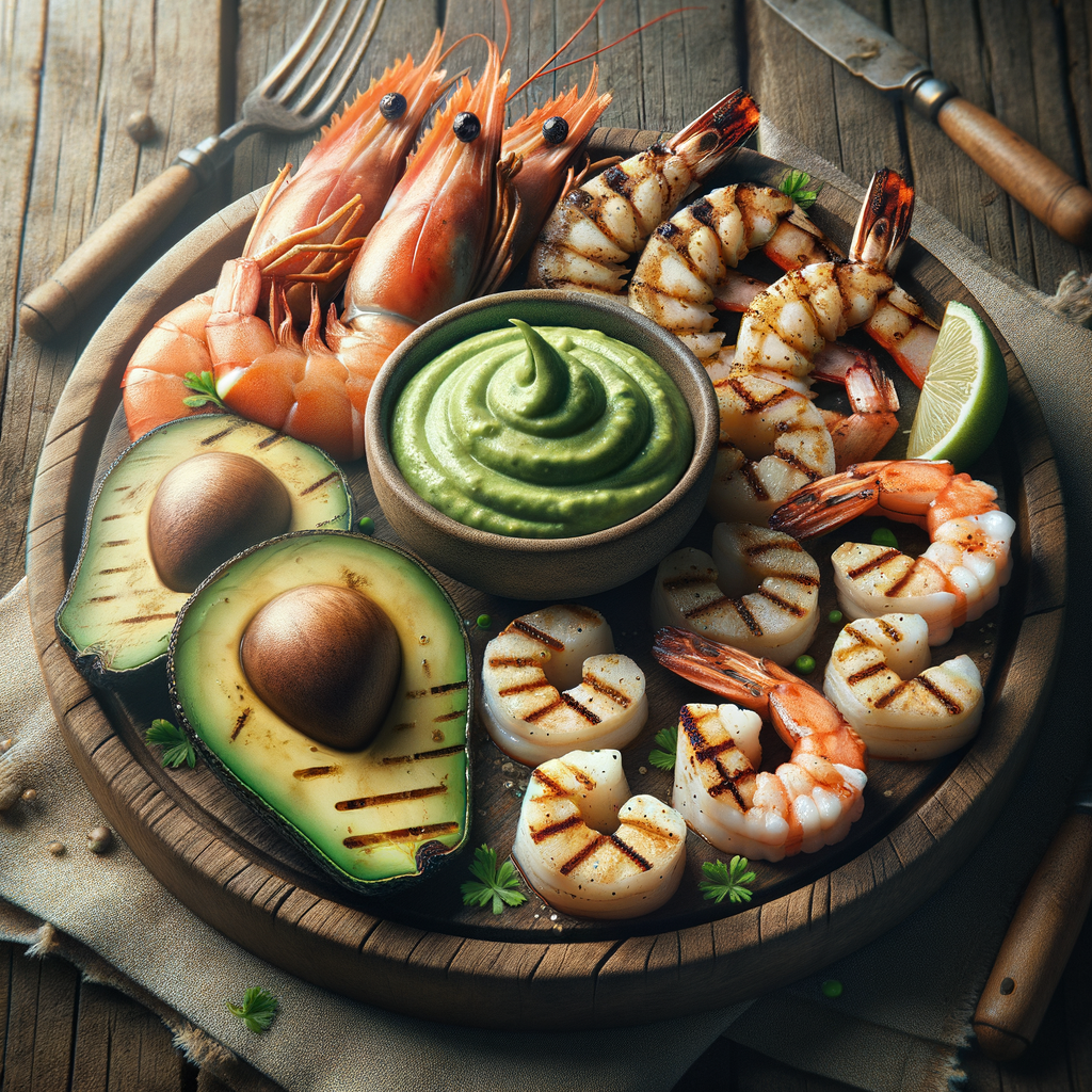 A medley of wood-grilled seafood including shrimp, scallops, and calamari, served with a side of zesty avocado aioli for dipping, garnished with lemon wedges and a sprinkle of fresh parsley.