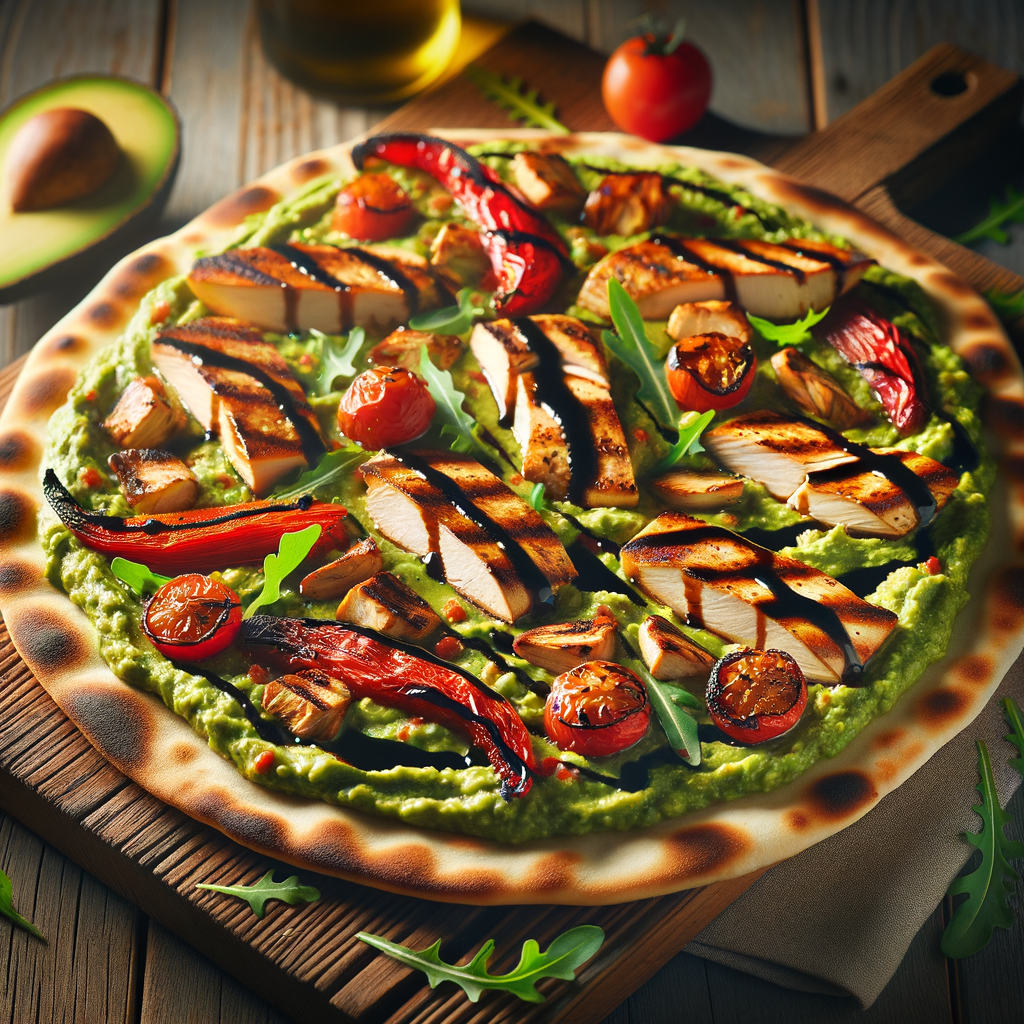 A rustic flatbread fresh from the wood-fired oven, topped with succulent slices of grilled chicken, a generous spread of creamy guacamole, roasted red peppers, and a drizzle of balsamic reduction, finished with a sprinkle of smoky gouda cheese and fresh arugula.