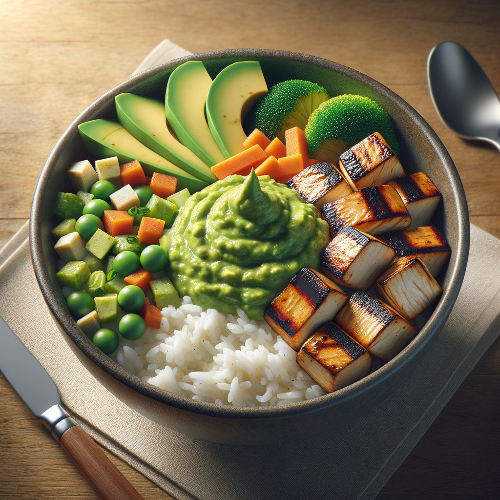 Grilled chicken or tofu glazed in a light teriyaki sauce, resting atop a bed of steamed rice and mixed vegetables, crowned with a generous dollop of smooth guacamole for a creamy finish.