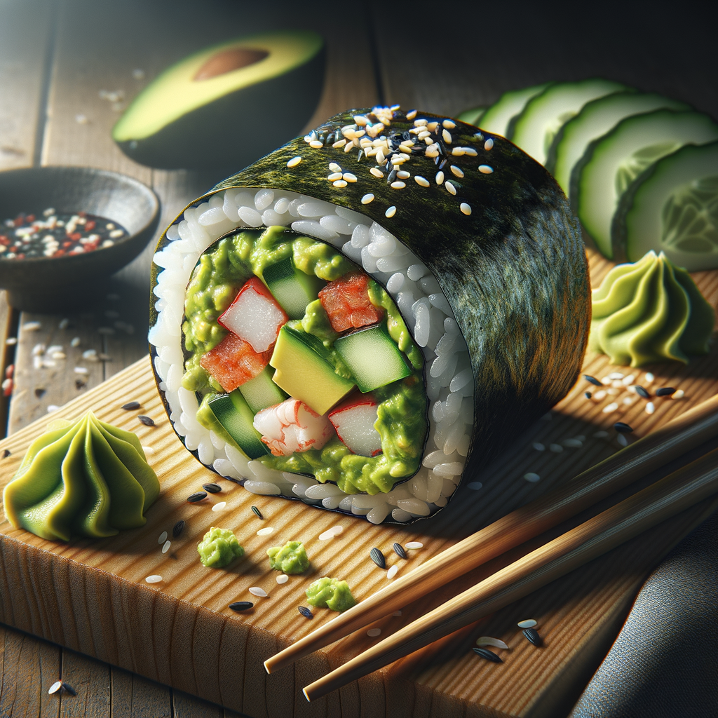 A fresh, hand-rolled sushi featuring a center of creamy guacamole, complemented by crisp cucumber, succulent crab meat, and a touch of sesame seeds, all wrapped in a delicate seaweed sheet and sushi rice.